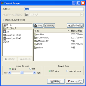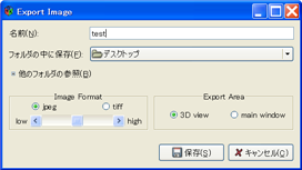 | 保存する画面([3D view]または[main window])を選択する. [保存]ボタンをクリックすると指定した場所にファイルが保存されます. |