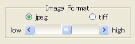 | 保存する画像の形式([jpeg]または[tiff])を選択する. [jpeg]を選択した場合,[low]から[high]の間で圧縮率を設定する. |