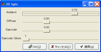 | 各要素を調整し、[適用]ボタンをクリックするとウィンドウを表示したまま3D画像に反映されます。 [OK]をクリックした場合、3D画像に反映しウィンドウを閉じます。 [キャンセル]をクリックすると適用せずにウィンドウを閉じます。 |