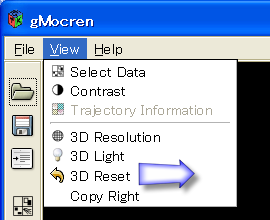| [View]メニューから[3D Reset]を選択します。 または、ツールバーの[3D Reset]ボタンをクリックします。 ウィンドウがデータ読み込み直後の状態に戻ります。 |
