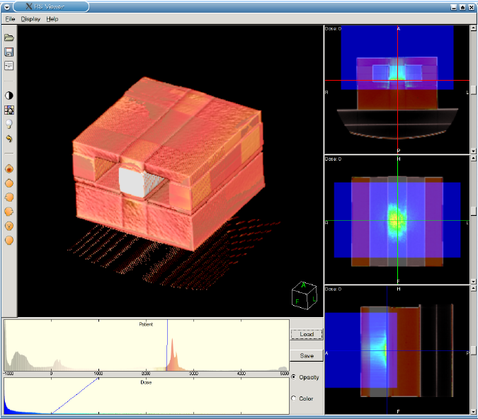 | gMocren is capable of displaying a dose distribution calculated by Geant4 simulation with a patient data. The appearance of gMocren consists of a volume rendering pane of a 3D image, two histogram panes to set transmission functions and a MPR (Multi-Planar Reformat) of three 2D images pane displaying three sections. |