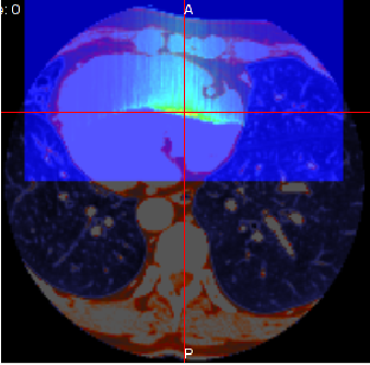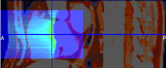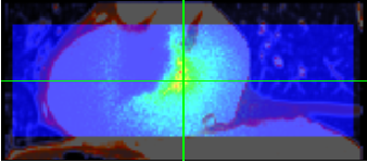 | 2D images of three sections of (a) x-y, (b) y-z and (c) z-x in the MPR pane. A part of blue area of the images can display a dose of radioactivity value of the place calculated dose of radioactivity distribution that you point out in a pointer. |