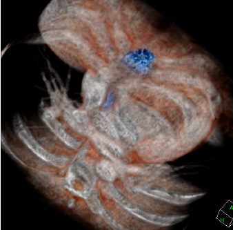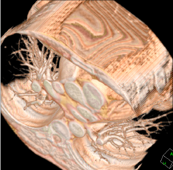 | gMocren 3D images of a breast by ray-casting method. These images are displayed with two different transfer functions that were changed in the upper histogram of the gMocren window. |
