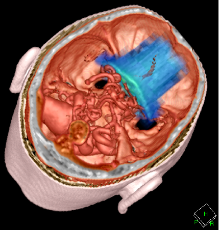 | A gMocren 3D image of the result of proton irradiations to a head data by Geant4 simulation. |